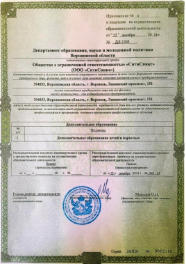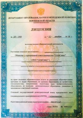Студия иностранных языков “CitySpeaks” имеет Лицензию на осуществление образовательной деятельности, выданную Департаментом образования, науки и молодёжной политики Воронежской области. Наличие Лицензии означает, что обучение в нашей студии происходит по специальным, разработанным и утверждённым учебным программам.